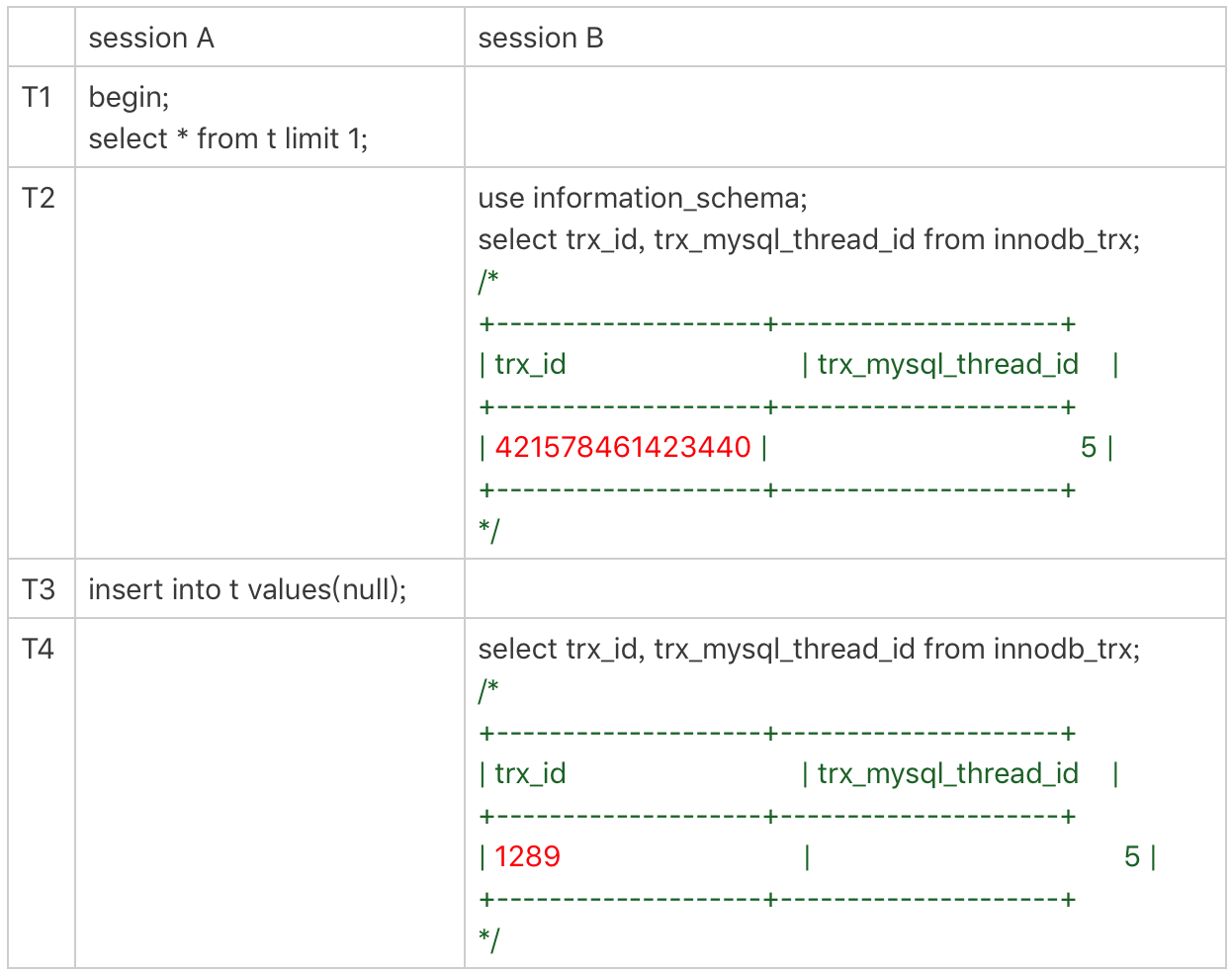 可以看到,T2时刻显示的trx_id是一个很大的数;T4时刻显示的trx_id是1289,看上去是一个比较正常的数字。这是什么原因呢?