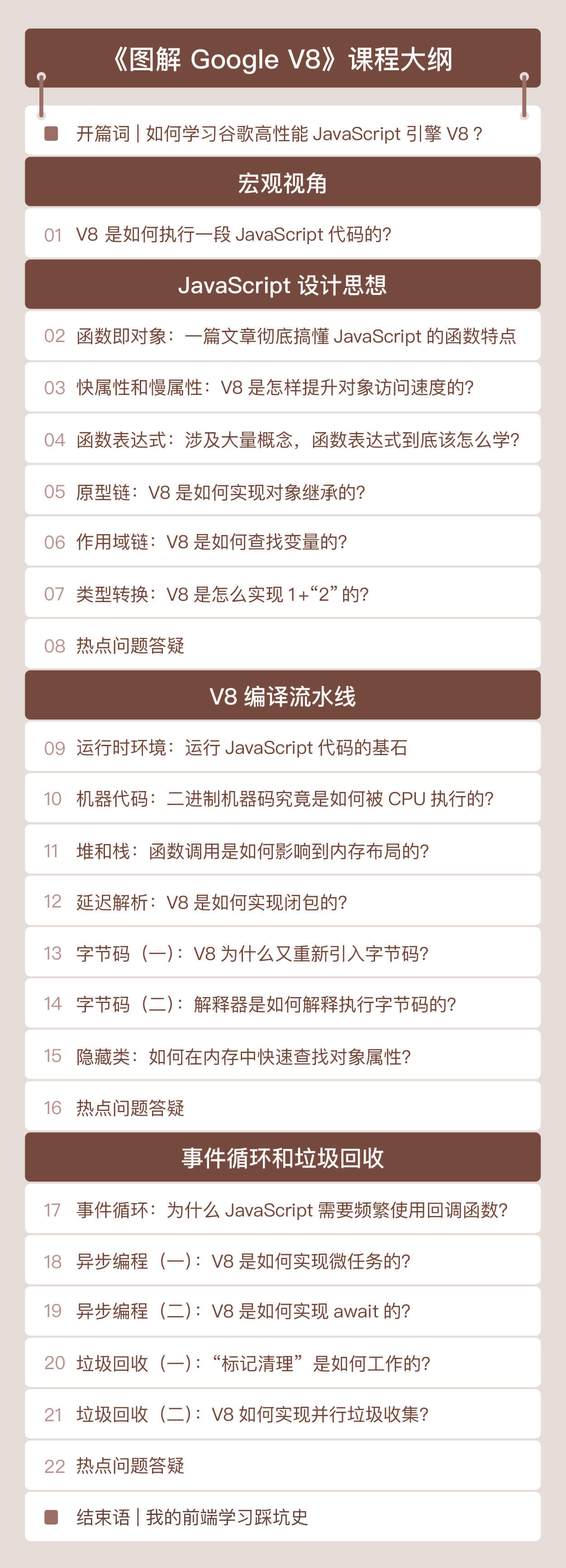 希望通过这门课程,带您了解完整的V8编译流水线,同时通过对V8工作机制的学习,搞懂JavaScript语言的核心特性,进而从根源解决程序问题,加快JavaScript的执行速度。